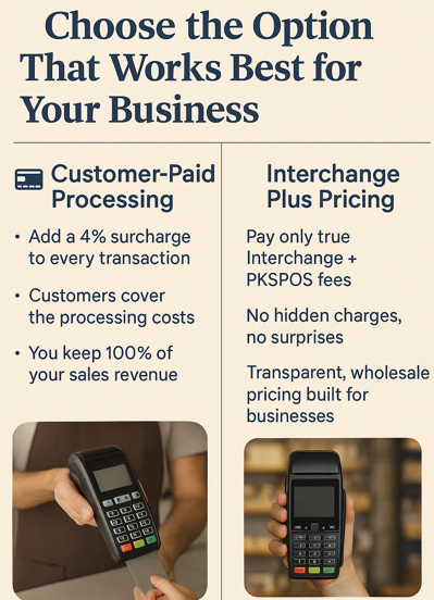 Whether you want to pass fees to customers or keep costs low and steady, the choice is yours. No hidden charges. No surprises. Just more money staying where it belongs — in your business.